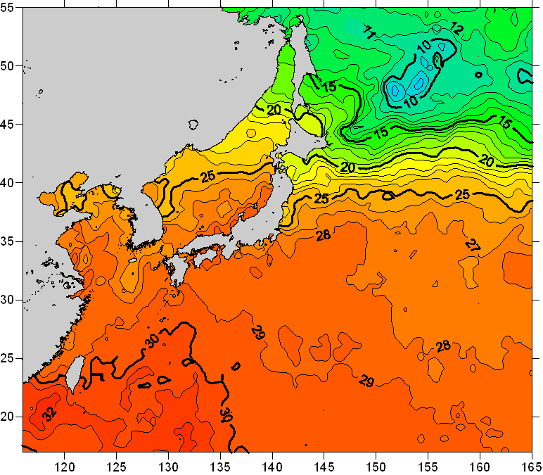 o 2010년 08월 13일 북서태평양 광역해양 수온분포 입니다. o 아래 위성 수온분포도는 국립수산과학원(NFRDI, Korea)과 일본동북대학교 (Tohoku University, Japan)가 공동연구개발 진행중, 1차 연구결과인 것으로 구름의 영향을 배제한 신기술의 수온정보입니다.