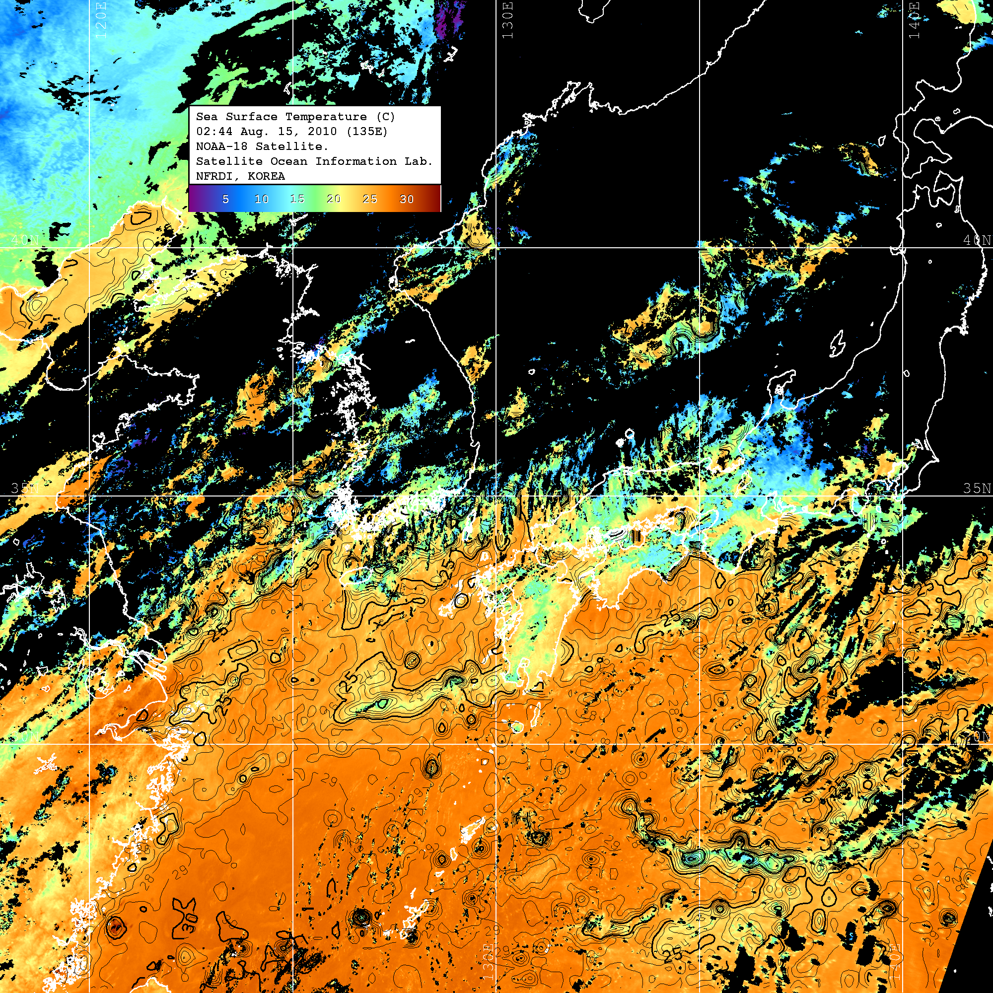 o 2010년 08월 15일 02시 44분 NOAA-18호 위성영상입니다. o 수온분포는 범례를 참고하시기 바랍니다. o 검은색은 구름을 나타냅니다. o 그림을 클릭하시면 크게 보실 수 있습니다.