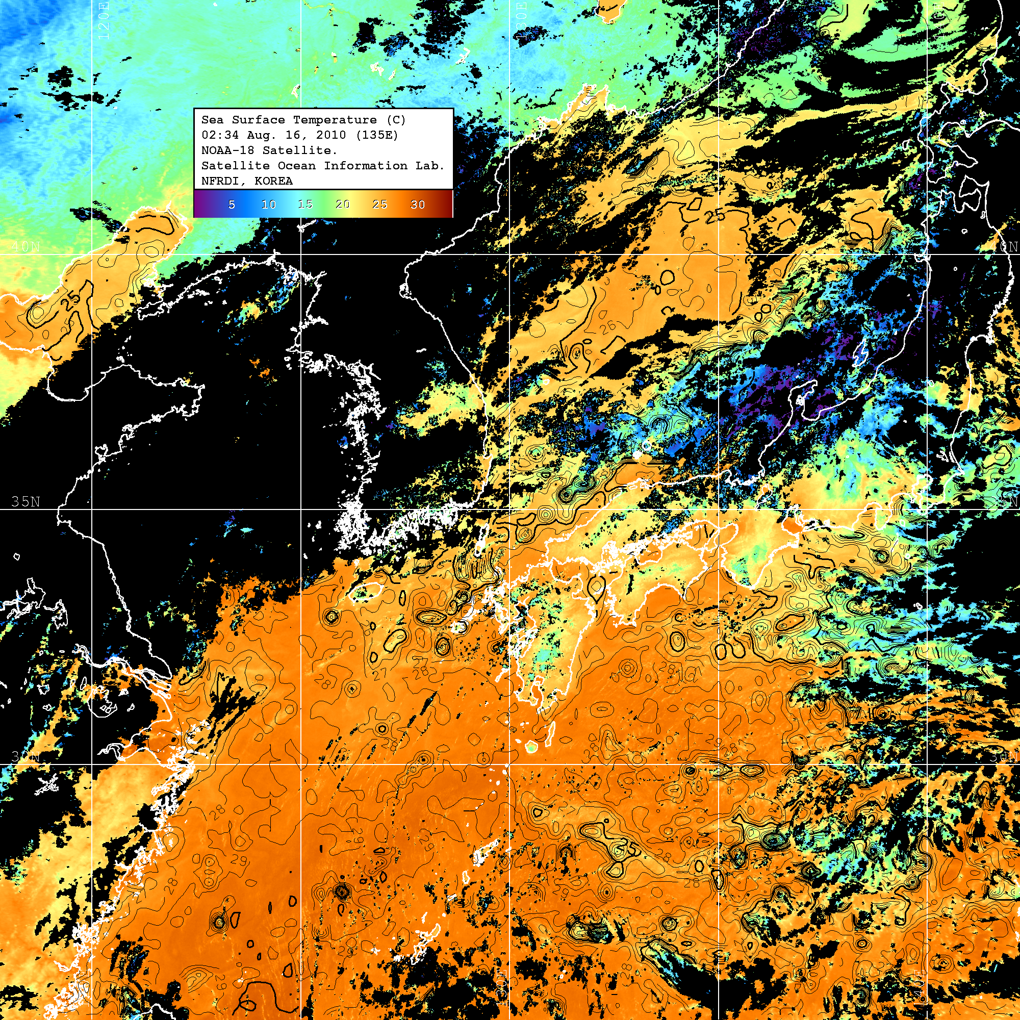 o 2010년 08월 16일 02시 34분 NOAA-18호 위성영상입니다. o 수온분포는 범례를 참고하시기 바랍니다. o 검은색은 구름을 나타냅니다. o 그림을 클릭하시면 크게 보실 수 있습니다.