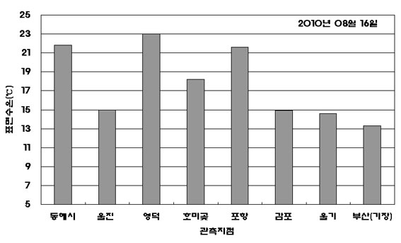 o 2010년 08월 16일 오전 11시를 기해 감포 및 울기 연안 냉수대 주의보를 발령합니다. o 2010년 08월 16일 오전 10시 현재 연안 표면수온은 감포 연안에서 14.9℃, 울기 연안에서 14.6℃로 나타나 냉수대 주의보를 발령합니다. o 또한 울진(15.0℃), 호미곶(18.2℃) 및 부산(기장, 13.3℃) 연안에 내려진 냉수대 주의보는 아직까지 유효합니다(해양자료속보 - 제3821호, 제3825호 참조). o 냉수대가 발생한 해역은 수온변동과 짙은 안개가 나타나고 있어 각별한 주의가 필요합니다.