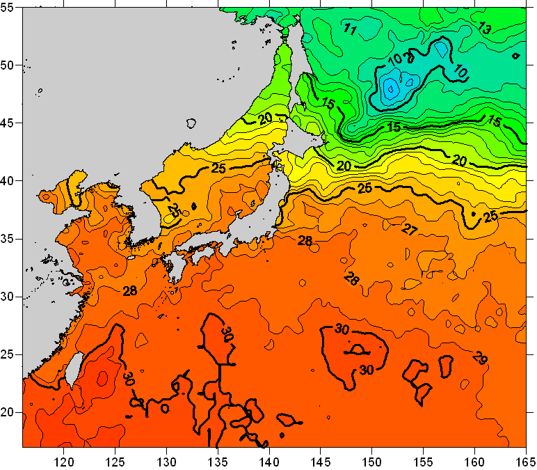o 2010년 08월 16일 북서태평양 광역해양 수온분포 입니다. o 아래 위성 수온분포도는 국립수산과학원(NFRDI, Korea)과 일본동북대학교 (Tohoku University, Japan)가 공동연구개발 진행중, 1차 연구결과인 것으로 구름의 영향을 배제한 신기술의 수온정보입니다.