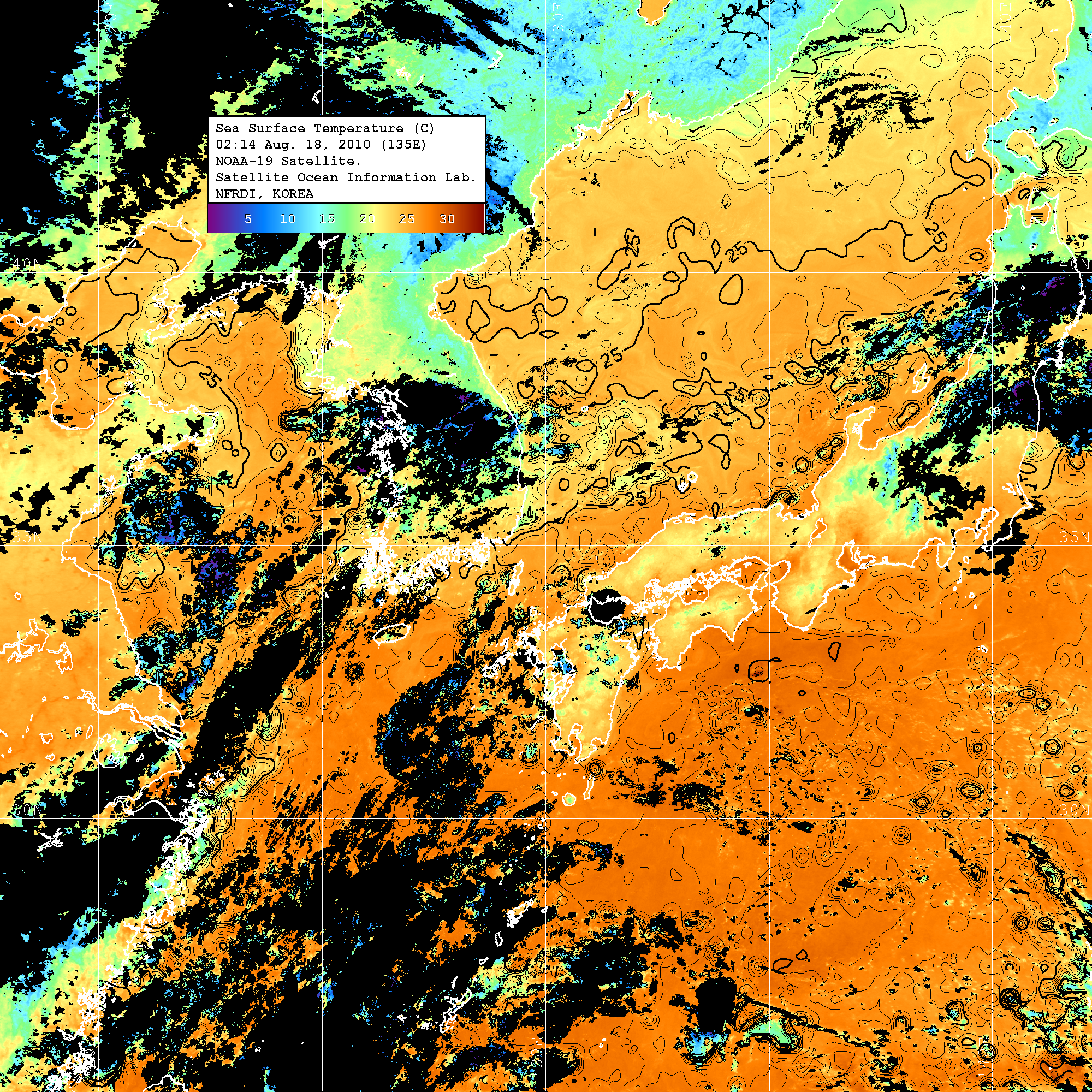 o 2010년 08월 18일 02시 14분 NOAA-19호 위성영상입니다. o 수온분포는 범례를 참고하시기 바랍니다. o 검은색은 구름을 나타냅니다. o 그림을 클릭하시면 크게 보실 수 있습니다.