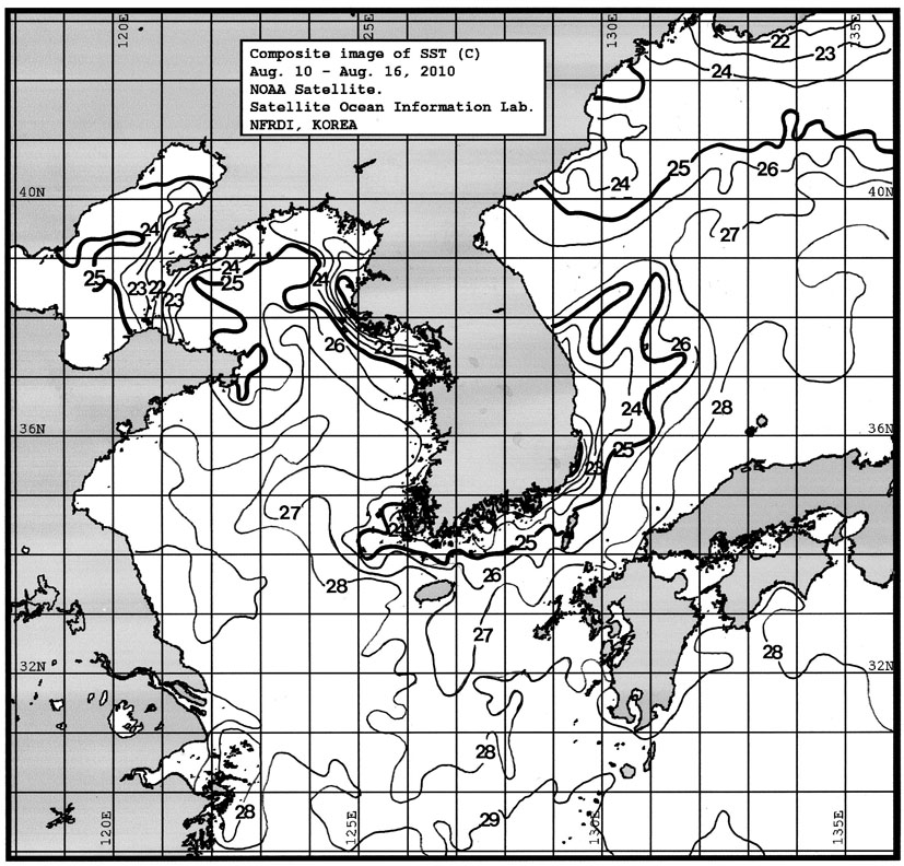 o 금주(2010.08.10~2010.08.16)의 한국근해 표면수온은 대화퇴 근해 27~28도, 울릉도 근해 25~26도, 대마도 근해 24~26도, 제주도 근해 26~28도, 이어도 근해 28~29도, 가거초 근해 25~26도, 어청도 근해 27~28도로 나타납니다. o「평년에 비해」대화퇴 근해 2.7도 높게, 울릉도 근해 비슷하게, 대마도 근해 2.1도 낮게, 제주도 근해 비슷하게, 이어도 근해 0.6도 높게, 가거초 근해 1.1도 낮게, 어청도 근해는 1.6도 높게 나타납니다. o「전년에 비해」대화퇴 근해 4.5도 높게, 울릉도 근해 0.5도 높게, 대마도 근해 1.5도 낮게, 제주도 근해 0.5도 낮게, 이어도 근해 2.5도 높게, 가거초 근해 1.0도 낮게, 어청도 근해는 2.5도 높게 나타납니다. o 수온 전선대는 우리나라 제주해협에서 대한해협까지 25도를 중심으로 형성됩니다.