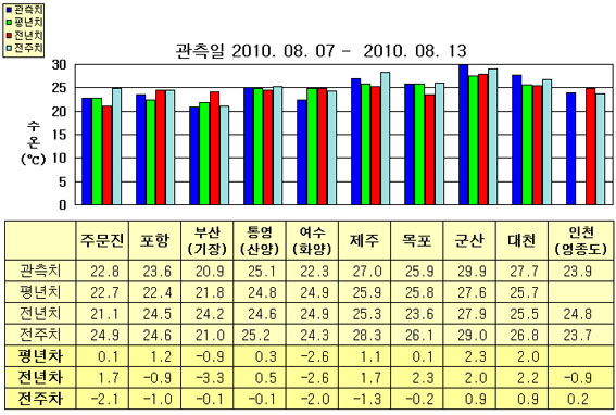 o 금주(2010.08.07~2010.08.13)의 한반도 연안 표면수온은 동해 연안역에서 섭씨 20.5~23.5도, 남해 연안역 22.0~27.0도, 서해 연안역에서 23.5~29.0도로 나타납니다. o 평년에 비해 부산 1.0도 낮음을 제외한 동해 연안역은 0.5~1.5도 높게, 여수(화양) 2.5도 낮음을 제외한 남해 연안역은 0.5~1.0도 높게, 목포 비슷함을 제외한 서해 연안역은 2.0~2.5도 높게 나타납니다. o 전년에 비해 주문진 1.7도 높음을 제외한 동해 연안역은 1.0~3.5도 낮게, 여수(화양) 2.5도 낮음을 제외한 남해 연안역은 0.5~2.0도 높게, 인천(용유도) 1.0도 낮음을 제외한 서해 연안역은 2.0~2.5도 높게 나타납니다.