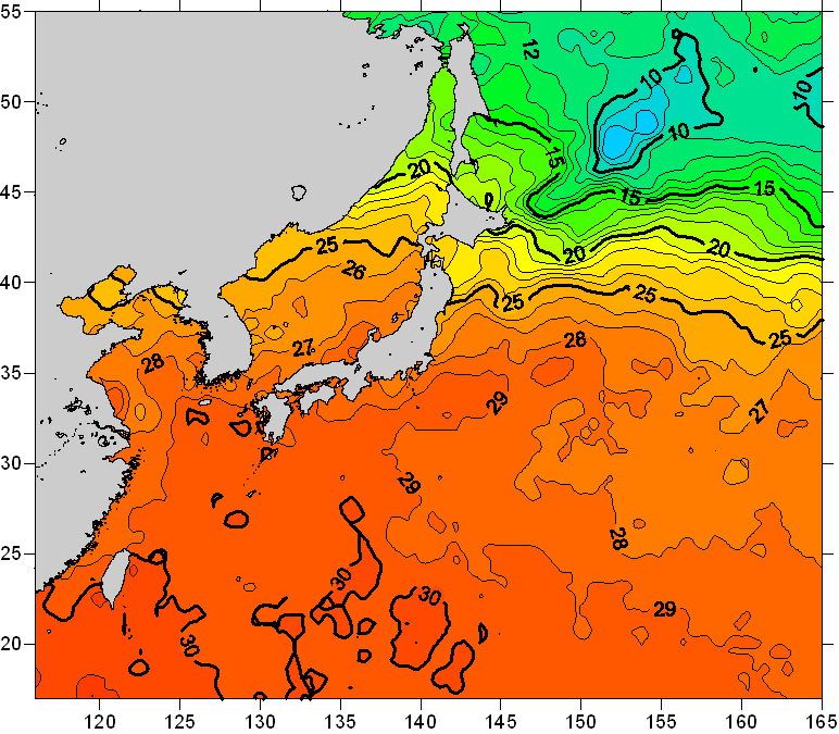 o 2010년 08월 19일 북서태평양 광역해양 수온분포 입니다. o 아래 위성 수온분포도는 국립수산과학원(NFRDI, Korea)과 일본동북대학교 (Tohoku University, Japan)가 공동연구개발 진행중, 1차 연구결과인 것으로 구름의 영향을 배제한 신기술의 수온정보입니다.
