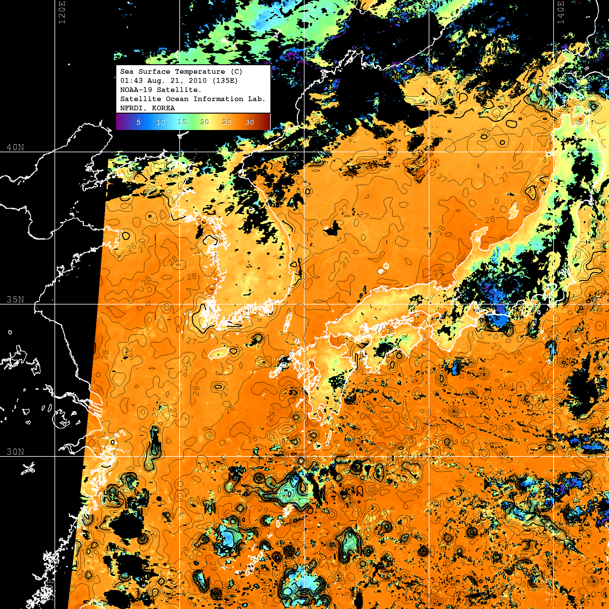 o 수온분포는 범례를 참고하시기 바랍니다. o 검은색은 구름을 나타냅니다. o 그림을 클릭하시면 크게 보실 수 있습니다 . | |||||