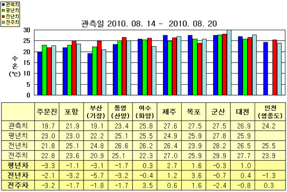o 금주(2010.08.14~2010.08.20)의 한반도 연안 표면수온은 동해 연안역에서 섭씨 19.0~22.0도, 남해 연안역 23.5~27.5도, 서해 연안역에서 24.0~27.5도로 나타납니다. o 평년에 비해 동해 연안역은 1.0~3.0도 낮게, 통영(산양) 1.7도 낮음을 제외한 남해 연안역은 0.5~2.5도 높게, 군산 0.3도 낮음을 제외한 서해 연안역은 1.0~1.5도 높게 나타납니다. o 전년에 비해 동해 연안역은 2.0~5.5도 낮게, 제주 1.2도 높음을 제외한 남해 연안역은 0.5~3.0도 낮게, 군산 및 인천(용유도) 1.0도 낮음을 제외한 서해 연안역은 0.5~3.5도 높게 나타납니다.