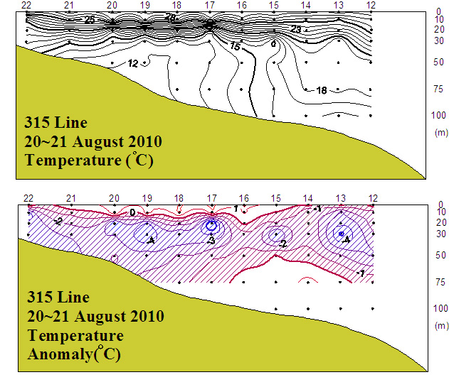ㅇ 2010년 8월 20~21일 국립수산과학원 남서해수산연구소에서 조사한 동중국해 북부해역(315선)의 수온 수직분포도와 평년편차도입니다.