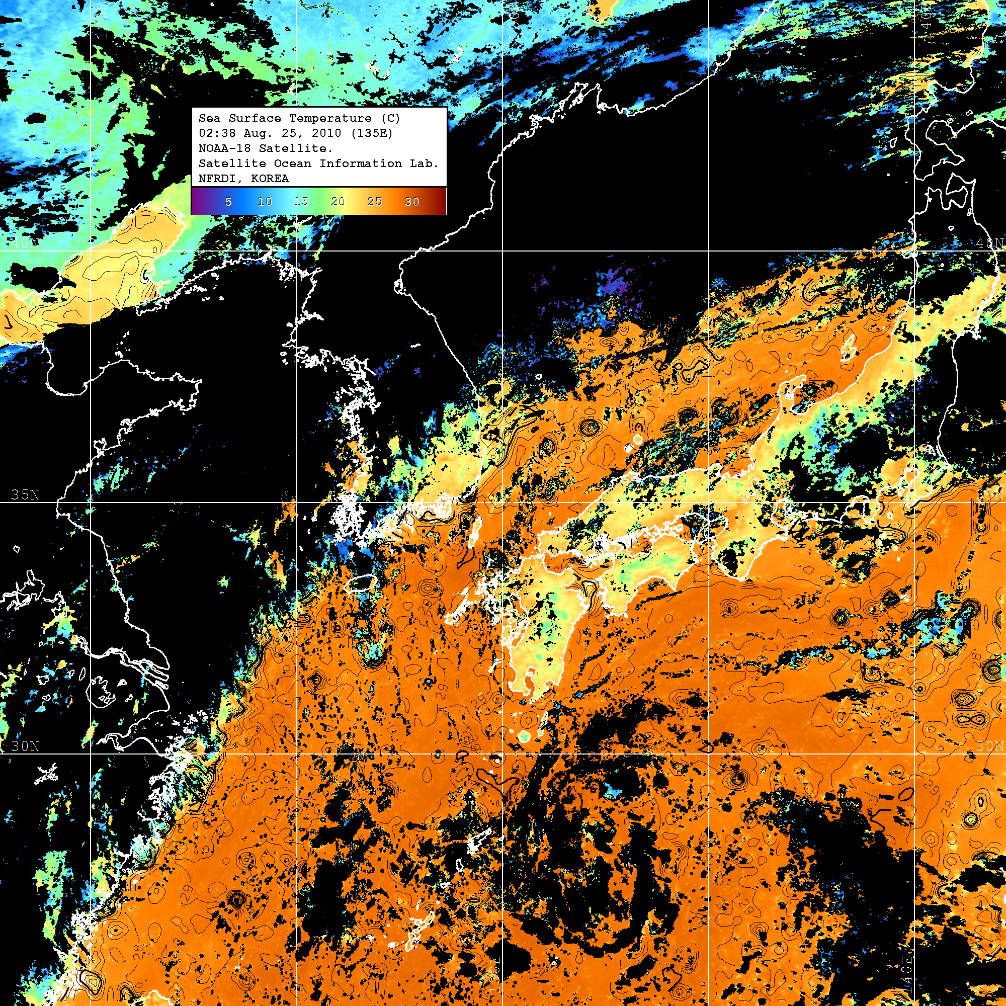 o 2010년 08월 25일 02시 38분 NOAA-18호 위성영상입니다. o 수온분포는 범례를 참고하시기 바랍니다. o 검은색은 구름을 나타냅니다. o 그림을 클릭하시면 크게 보실 수 있습니다.