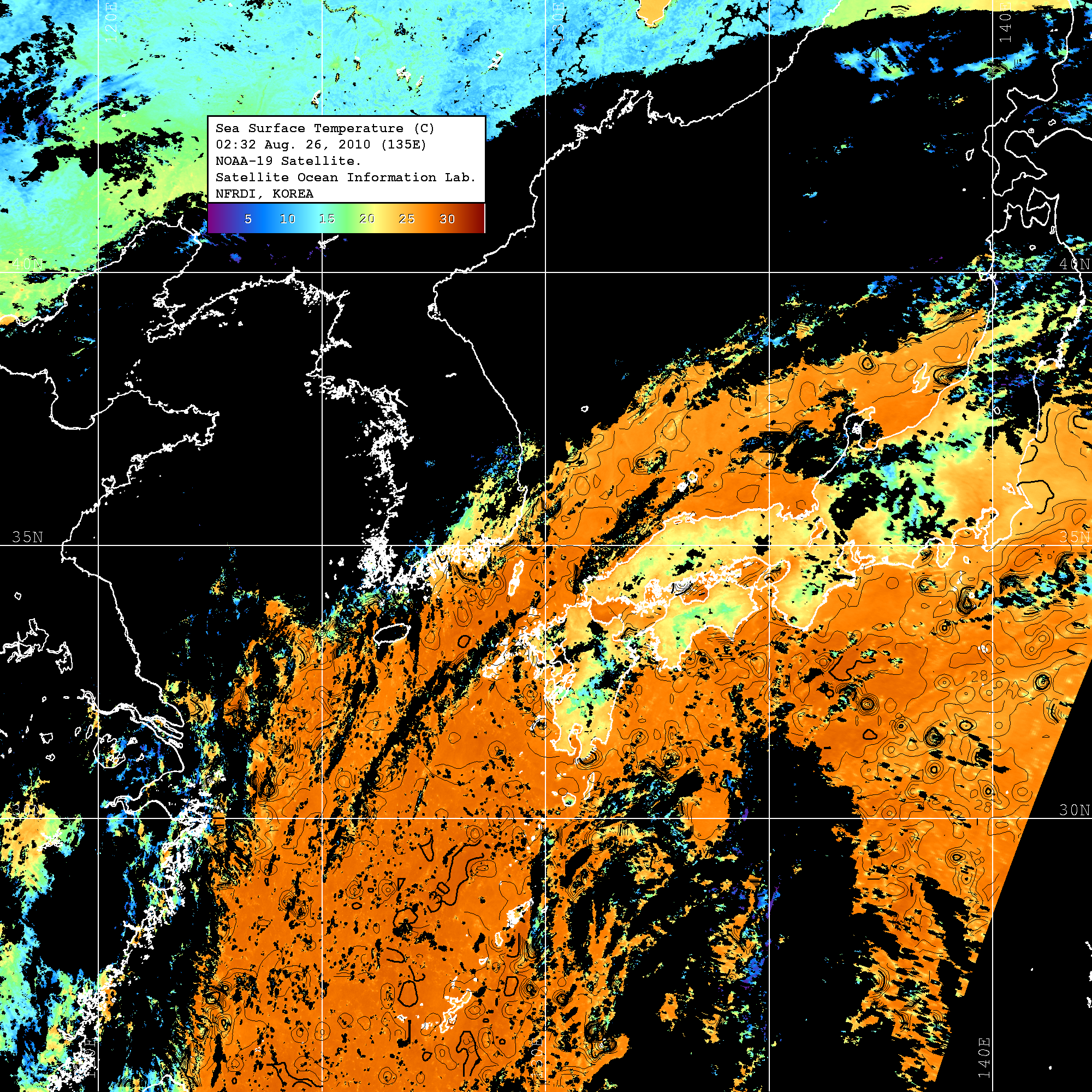 o 2010년 08월 26일 02시 32분 NOAA-19호 위성영상입니다. o 수온분포는 범례를 참고하시기 바랍니다. o 검은색은 구름을 나타냅니다. o 그림을 클릭하시면 크게 보실 수 있습니다.