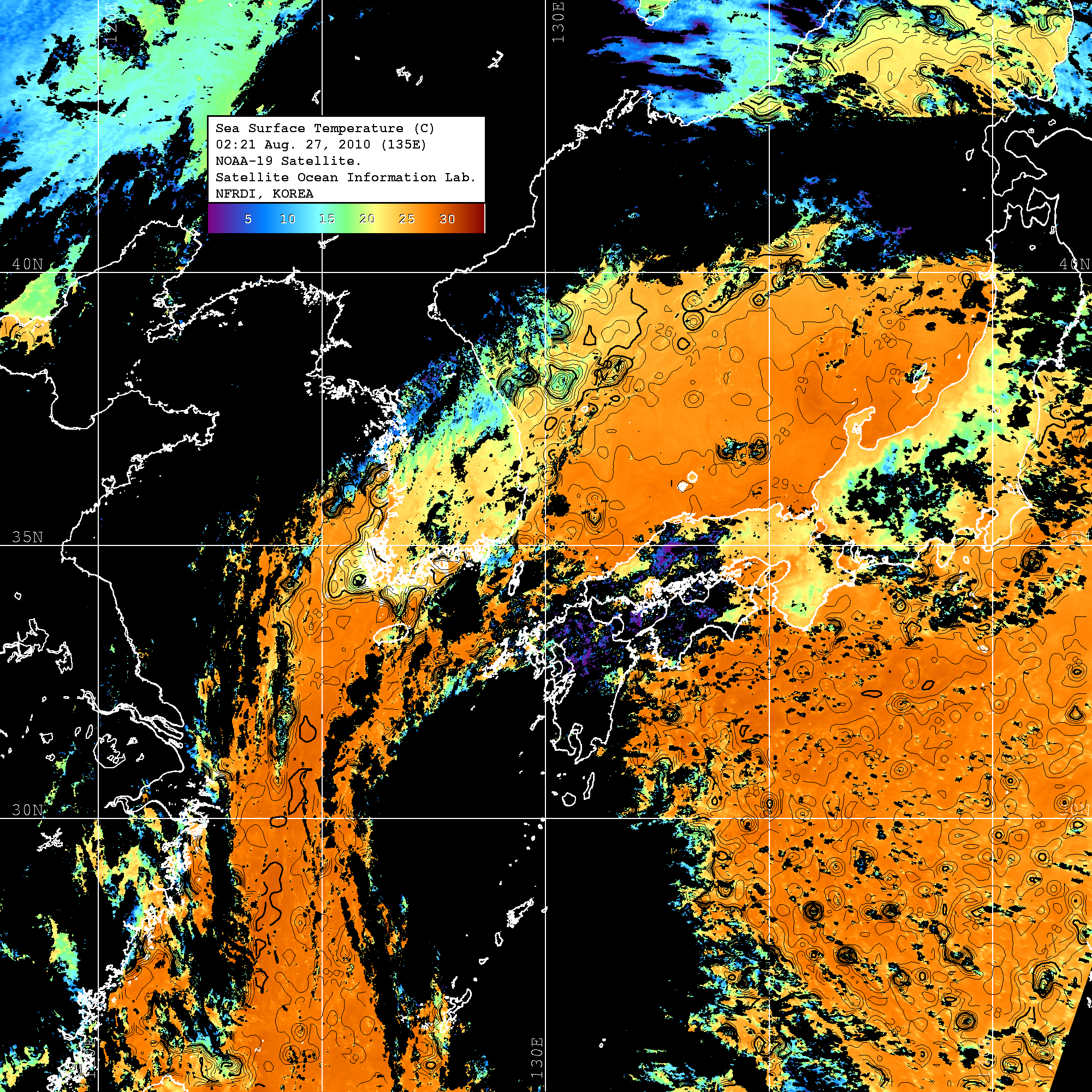 o 2010년 08월 27일 02시 21분 NOAA-19호 위성영상입니다. o 수온분포는 범례를 참고하시기 바랍니다. o 검은색은 구름을 나타냅니다. o 그림을 클릭하시면 크게 보실 수 있습니다.