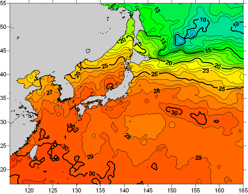 o 2010년 08월 27일 북서태평양 광역해양 수온분포 입니다. o 아래 위성 수온분포도는 국립수산과학원(NFRDI, Korea)과 일본동북대학교 (Tohoku University, Japan)가 공동연구개발 진행중, 1차 연구결과인 것으로 구름의 영향을 배제한 신기술의 수온정보입니다.