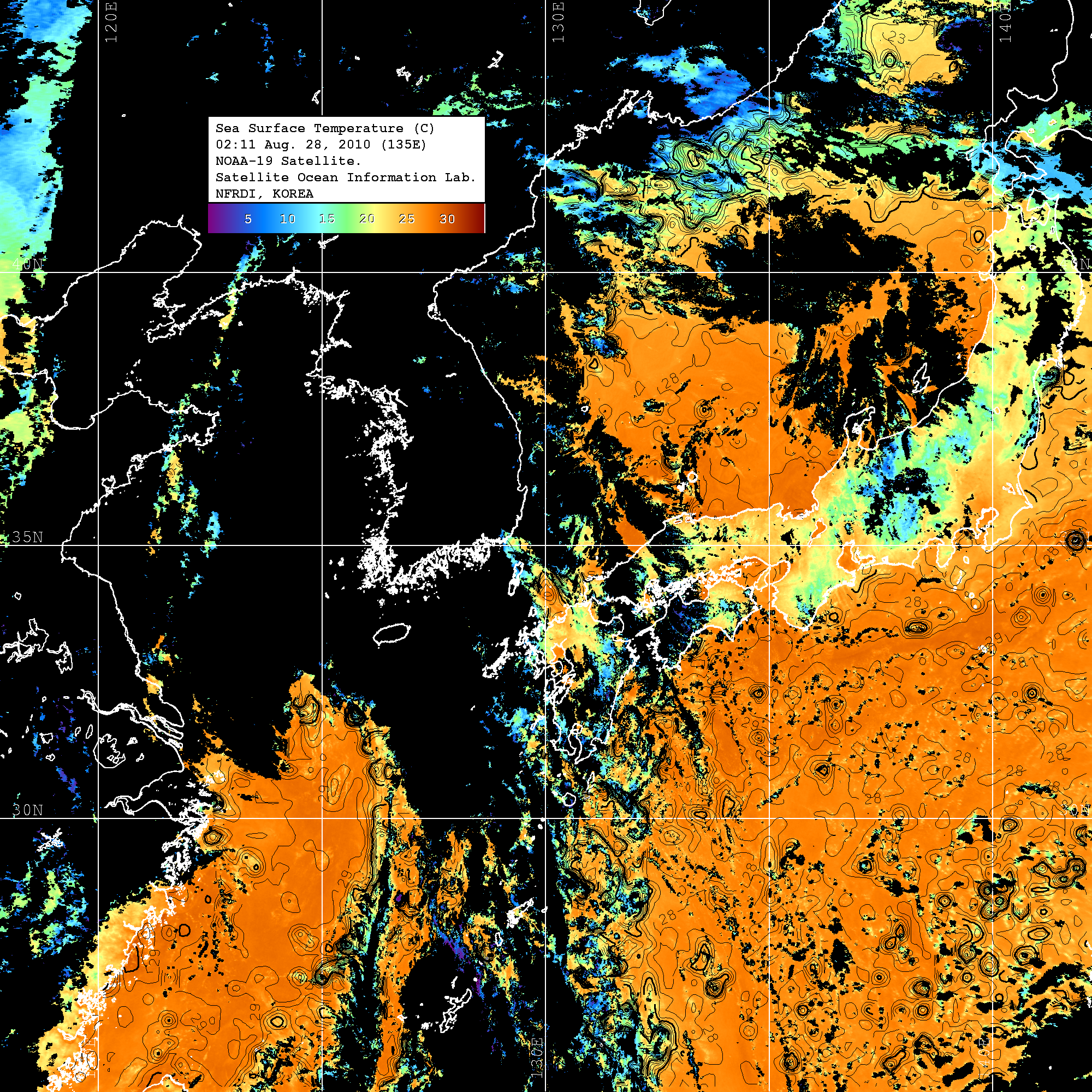 o 2010년 08월 28일 02시 11분 NOAA-19호 위성영상입니다. o 수온분포는 범례를 참고하시기 바랍니다. o 검은색은 구름을 나타냅니다. o 그림을 클릭하시면 크게 보실 수 있습니다.