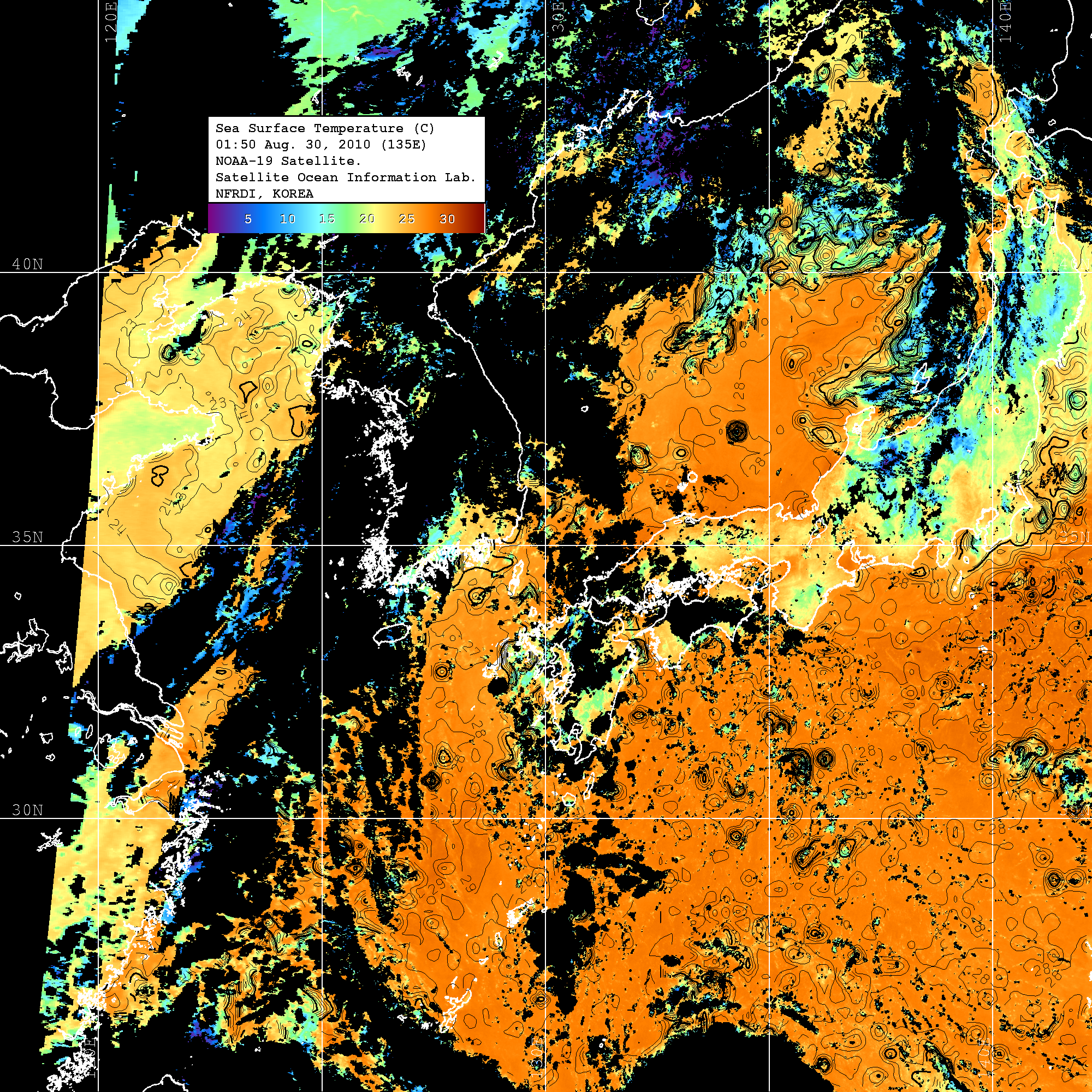 o 2010년 08월 30일 01시 50분 NOAA-19호 위성영상입니다. o 수온분포는 범례를 참고하시기 바랍니다. o 검은색은 구름을 나타냅니다. o 그림을 클릭하시면 크게 보실 수 있습니다.
