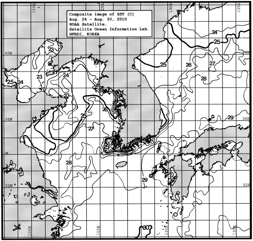 o 금주(2010.08.24~2010.08.30)의 한국근해 표면수온은 대화퇴 근해 27~28도, 울릉도 근해 27~28도, 대마도 근해 28~29도, 제주도 근해 28~29도, 이어도 근해 29~30도, 가거초 근해 27~28도, 어청도 근해 26~27도로 나타납니다. o「평년에 비해」대화퇴 근해 3.2도 높게, 울릉도 근해 2.7도 높게, 대마도 근해 2.2도 높게, 제주도 근해 1.7도 높게, 이어도 근해 1.9도 높게, 가거초 근해 2.0도 높게, 어청도 근해는 1.0도 높게 나타납니다. o「전년에 비해」대화퇴 근해 2.5도 높게, 울릉도 근해 1.5도 높게, 대마도 근해 1.0도 높게, 제주도 근해 비슷하게, 이어도 근해 비슷하게, 가거초 근해 비슷하게, 어청도 근해는 0.5도 낮게 나타납니다. o 수온 전선대는 우리나라 제주해협에서 대한해협까지 28도를 중심으로 형성됩니다.