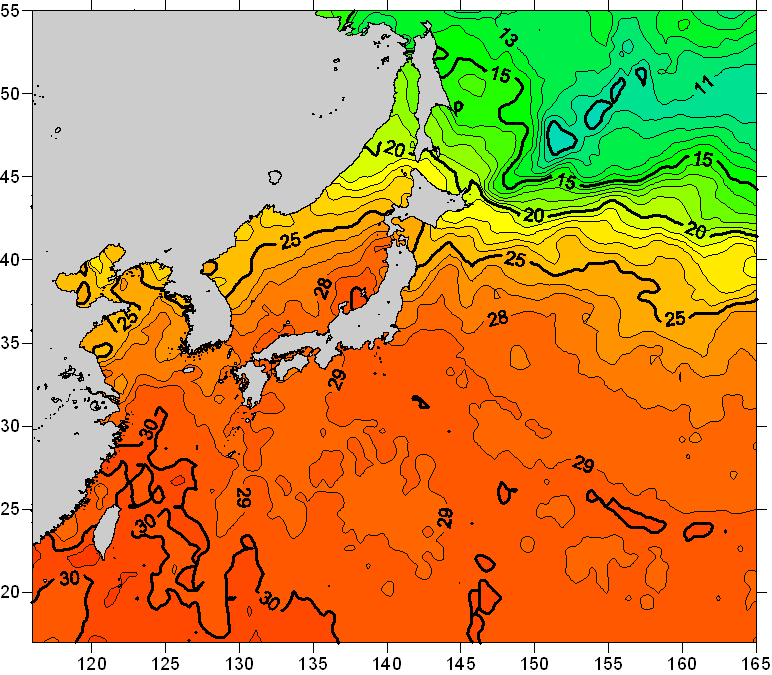 o 2010년 08월 29일 북서태평양 광역해양 수온분포 입니다. o 아래 위성 수온분포도는 국립수산과학원(NFRDI, Korea)과 일본동북대학교 (Tohoku University, Japan)가 공동연구개발 진행중, 1차 연구결과인 것으로 구름의 영향을 배제한 신기술의 수온정보입니다.
