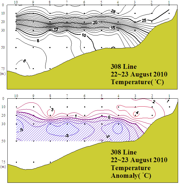 ㅇ 수온약층은 10~30m 부근에서 형성되었으며 정점 9~10의 저층에 냉수가 존재하고 있었습니다. ㅇ 평년에 비하여 표층~20m 까지는 1~4℃의 고온현상을 보인 반면, 20m 이심층에서는 1~3℃의 저온현상을 보였습니다.