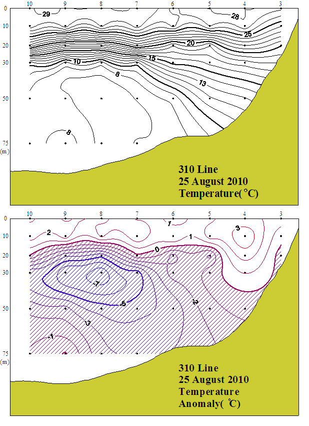 ㅇ 2010년 8월 25일 국립수산과학원 서해수산연구소에서 조사한 310선(영광 서방)의 수직수온분포도 및 평년편차도입니다.