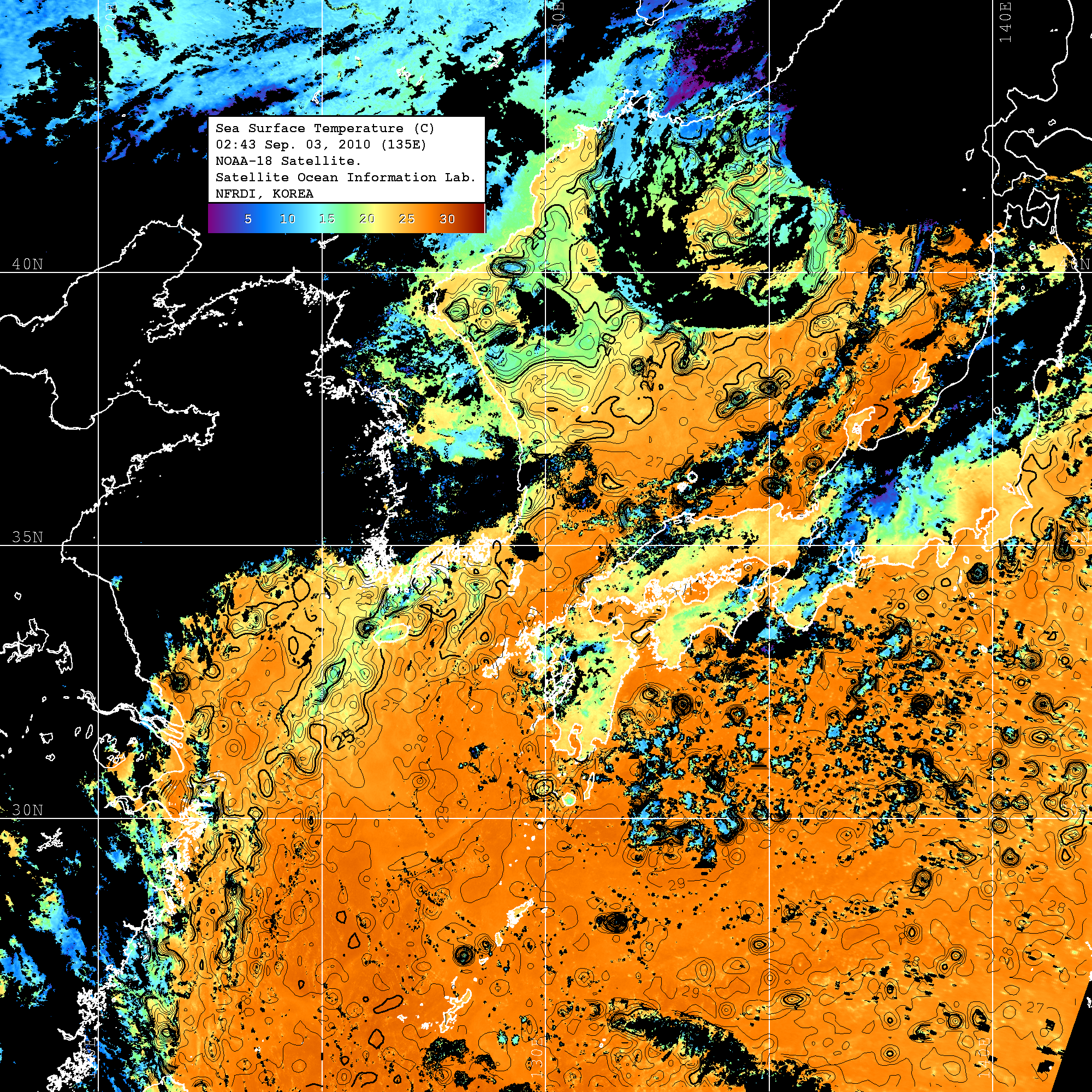 o 2010년 09월 03일 02시 43분 NOAA-18호 위성영상입니다. o 수온분포는 범례를 참고하시기 바랍니다. o 검은색은 구름을 나타냅니다. o 그림을 클릭하시면 크게 보실 수 있습니다.