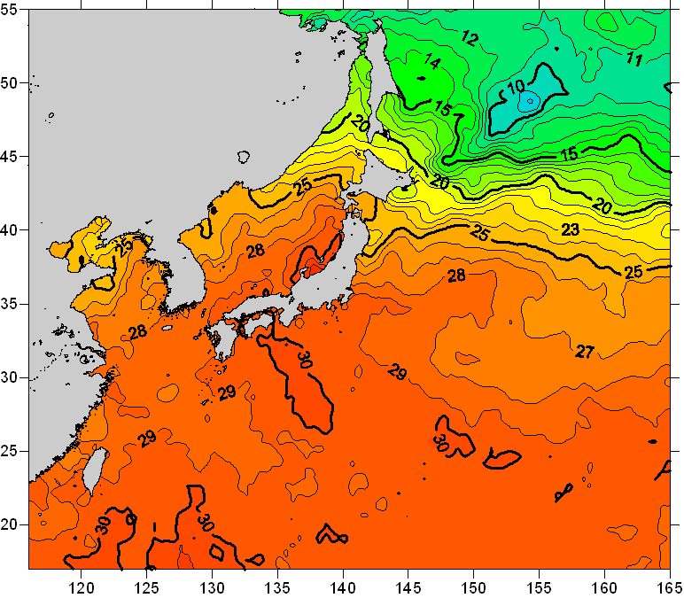 o 2010년 09월 02일 북서태평양 광역해양 수온분포 입니다. o 아래 위성 수온분포도는 국립수산과학원(NFRDI, Korea)과 일본동북대학교 (Tohoku University, Japan)가 공동연구개발 진행중, 1차 연구결과인 것으로 구름의 영향을 배제한 신기술의 수온정보입니다.
