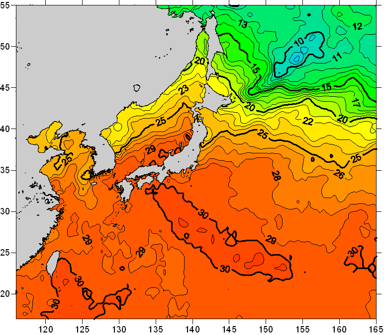 o 2010년 09월 04일 북서태평양 광역해양 수온분포 입니다. o 아래 위성 수온분포도는 국립수산과학원(NFRDI, Korea)과 일본동북대학교 (Tohoku University, Japan)가 공동연구개발 진행중, 1차 연구결과인 것으로 구름의 영향을 배제한 신기술의 수온정보입니다.