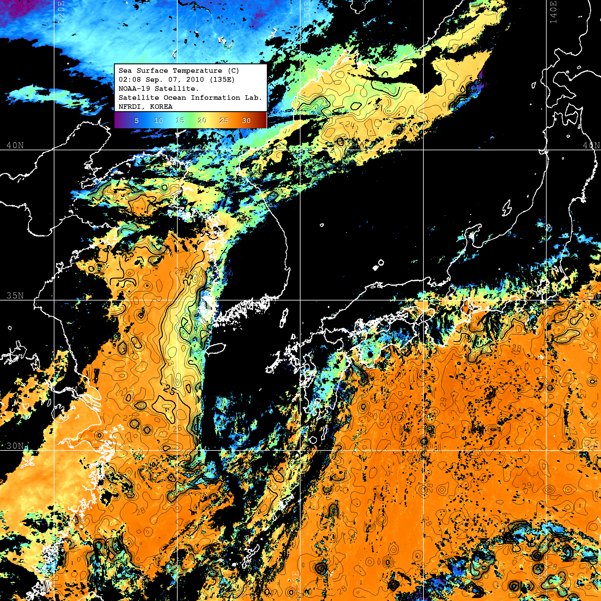 o 2010년 09월 07일 02시 08분 NOAA-19호 위성영상입니다. o 수온분포는 범례를 참고하시기 바랍니다. o 검은색은 구름을 나타냅니다. o 그림을 클릭하시면 크게 보실 수 있습니다.
