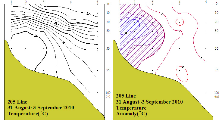 ㅇ 2010년 8월 31일~9월 3일 국립수산과학원 남서해수산연구소에서 조사한 205선(소리도 남동방)의 수직수온분포도 및 평년편차도 입니다.
