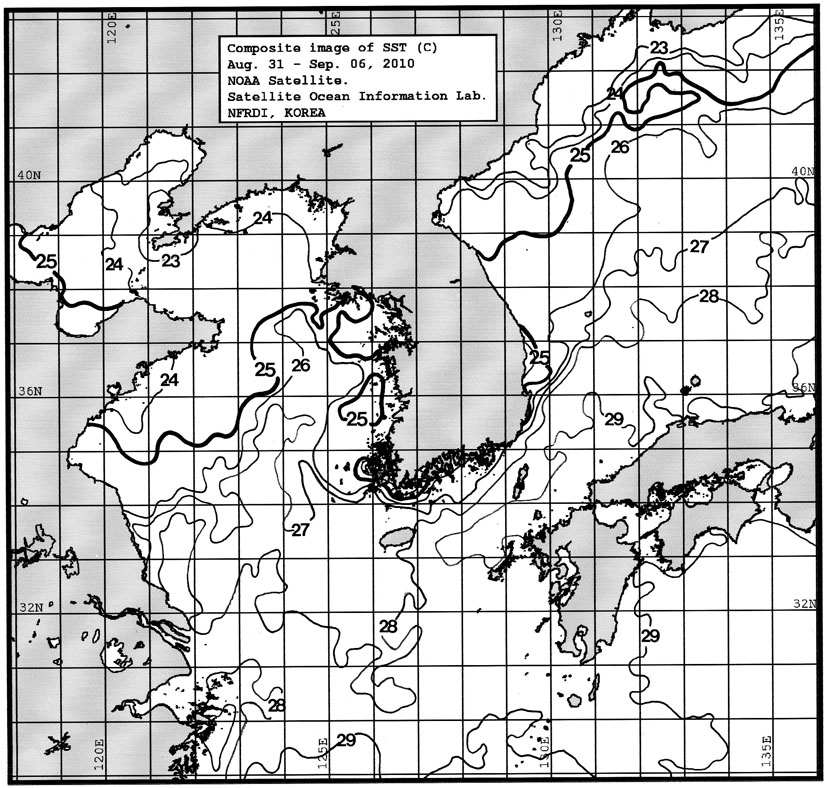 o 금주(2010.08.31~2010.09.06)의 한국근해 표면수온은 대화퇴 근해 27~28도, 울릉도 근해 26~27도, 대마도 근해 28~29도, 제주도 근해 27~28도, 이어도 근해 27~28도, 가거초 근해 27~28도, 어청도 근해 25~26도로 나타납니다. o「평년에 비해」대화퇴 근해 3.8도 높게, 울릉도 근해 2.3도 높게, 대마도 근해 1.8도 높게, 제주도 근해 1.3도 높게, 이어도 근해 0.7도 높게, 가거초 근해 2.3도 높게, 어청도 근해는 1.0도 높게 나타납니다. o「전년에 비해」대화퇴 근해 4.0도 높게, 울릉도 근해 2.0도 높게, 대마도 근해 1.5도 높게, 제주도 근해 0.5도 높게, 이어도 근해 비슷하게, 가거초 근해 1.0도 높게, 어청도 근해는 1.0도 낮게 나타납니다. o 수온 전선대는 우리나라 제주해협에서 대한해협까지 27도를 중심으로 형성됩니다.