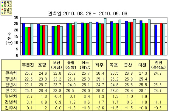 o 금주(2010.08.28~2010.09.03)의 한반도 연안 표면수온은 동해 연안역에서 섭씨 22.5~25.0도, 남해 연안역 25.0~26.5도, 서해 연안역에서 24.0~27.5도로 나타납니다. o 평년에 비해 부산(기장) 0.5도 낮음을 제외한 동해 연안역은 1.0~2.5도 높게, 남해 연안역은 0.5~1.5도 높게, 서해 연안역은 1.0~2.0도 높게 나타납니다. o 전년에 비해 부산(기장) 1.0도 낮음을 제외한 동해 연안역은 1.0~3.0도 높게, 남해 연안역은 0.5~2.0도 높게, 인천(용유도) 1.0도 낮음을 제외한 서해 연안역은 0.5~2.0도 높게 나타납니다.