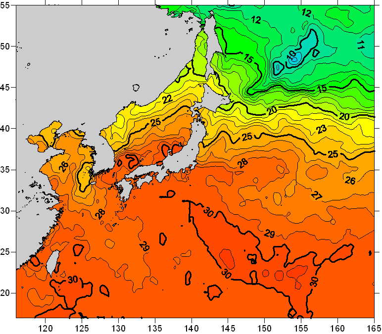 o 2010년 09월 07일 북서태평양 광역해양 수온분포 입니다. o 아래 위성 수온분포도는 국립수산과학원(NFRDI, Korea)과 일본동북대학교 (Tohoku University, Japan)가 공동연구개발 진행중, 1차 연구결과인 것으로 구름의 영향을 배제한 신기술의 수온정보입니다.