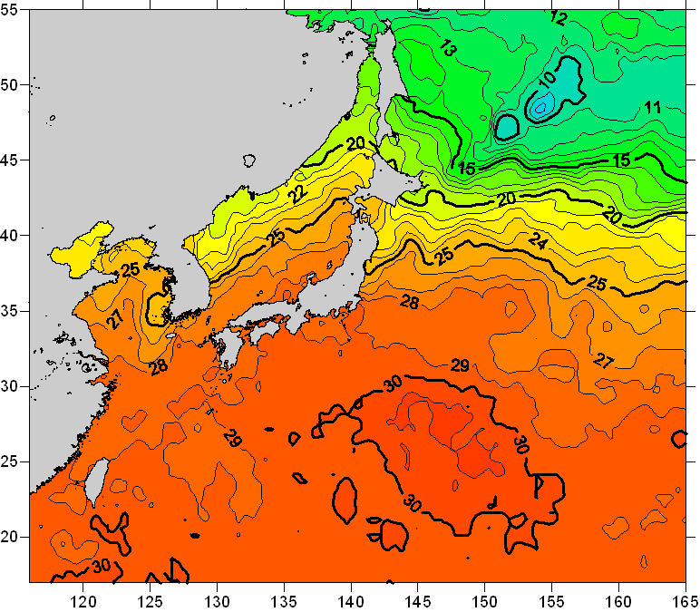 o 2010년 09월 08일 북서태평양 광역해양 수온분포 입니다. o 아래 위성 수온분포도는 국립수산과학원(NFRDI, Korea)과 일본동북대학교 (Tohoku University, Japan)가 공동연구개발 진행중, 1차 연구결과인 것으로 구름의 영향을 배제한 신기술의 수온정보입니다.