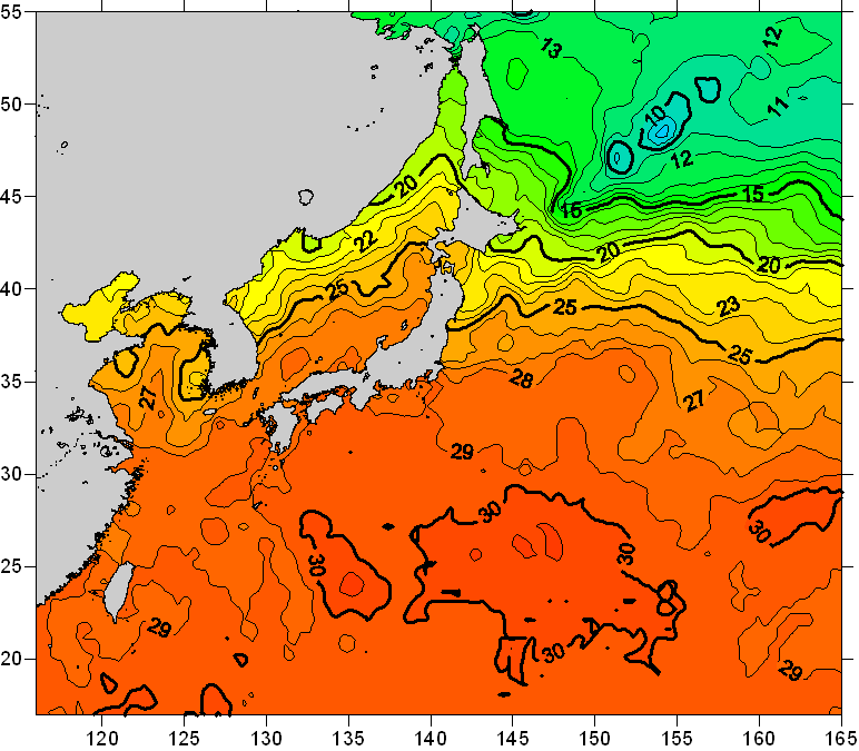 o 2010년 09월 09일 북서태평양 광역해양 수온분포 입니다. o 아래 위성 수온분포도는 국립수산과학원(NFRDI, Korea)과 일본동북대학교 (Tohoku University, Japan)가 공동연구개발 진행중, 1차 연구결과인 것으로 구름의 영향을 배제한 신기술의 수온정보입니다.