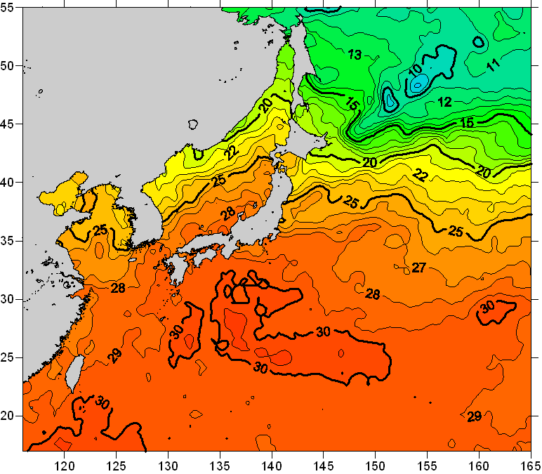 o 2010년 09월 11일 북서태평양 광역해양 수온분포 입니다. o 아래 위성 수온분포도는 국립수산과학원(NFRDI, Korea)과 일본동북대학교 (Tohoku University, Japan)가 공동연구개발 진행중, 1차 연구결과인 것으로 구름의 영향을 배제한 신기술의 수온정보입니다.