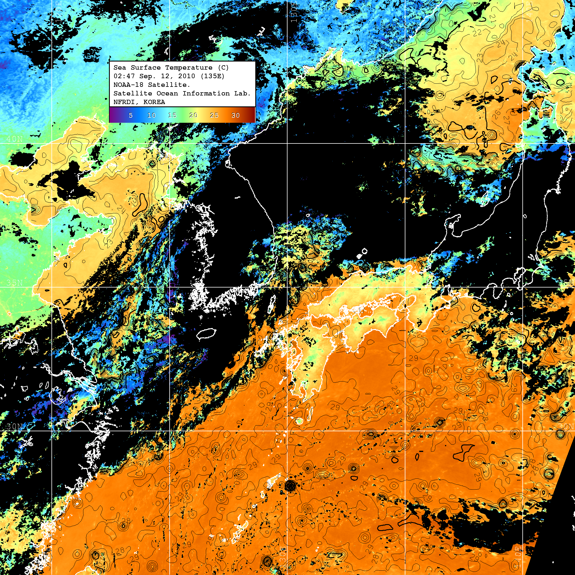 o 2010년 09월 12일 02시 47분 NOAA-18호 위성영상입니다. o 수온분포는 범례를 참고하시기 바랍니다. o 검은색은 구름을 나타냅니다. o 그림을 클릭하시면 크게 보실 수 있습니다.