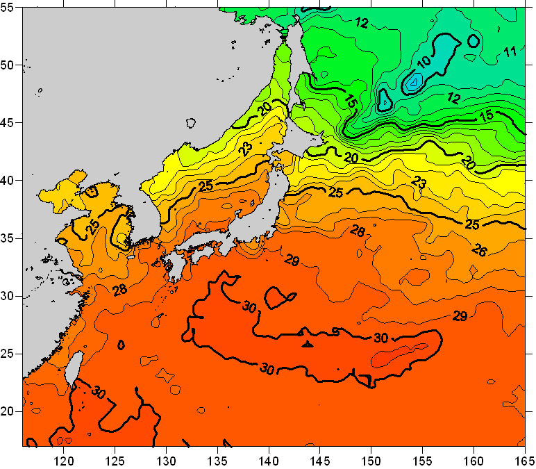 o 2010년 09월 12일 북서태평양 광역해양 수온분포 입니다. o 아래 위성 수온분포도는 국립수산과학원(NFRDI, Korea)과 일본동북대학교 (Tohoku University, Japan)가 공동연구개발 진행중, 1차 연구결과인 것으로 구름의 영향을 배제한 신기술의 수온정보입니다.
