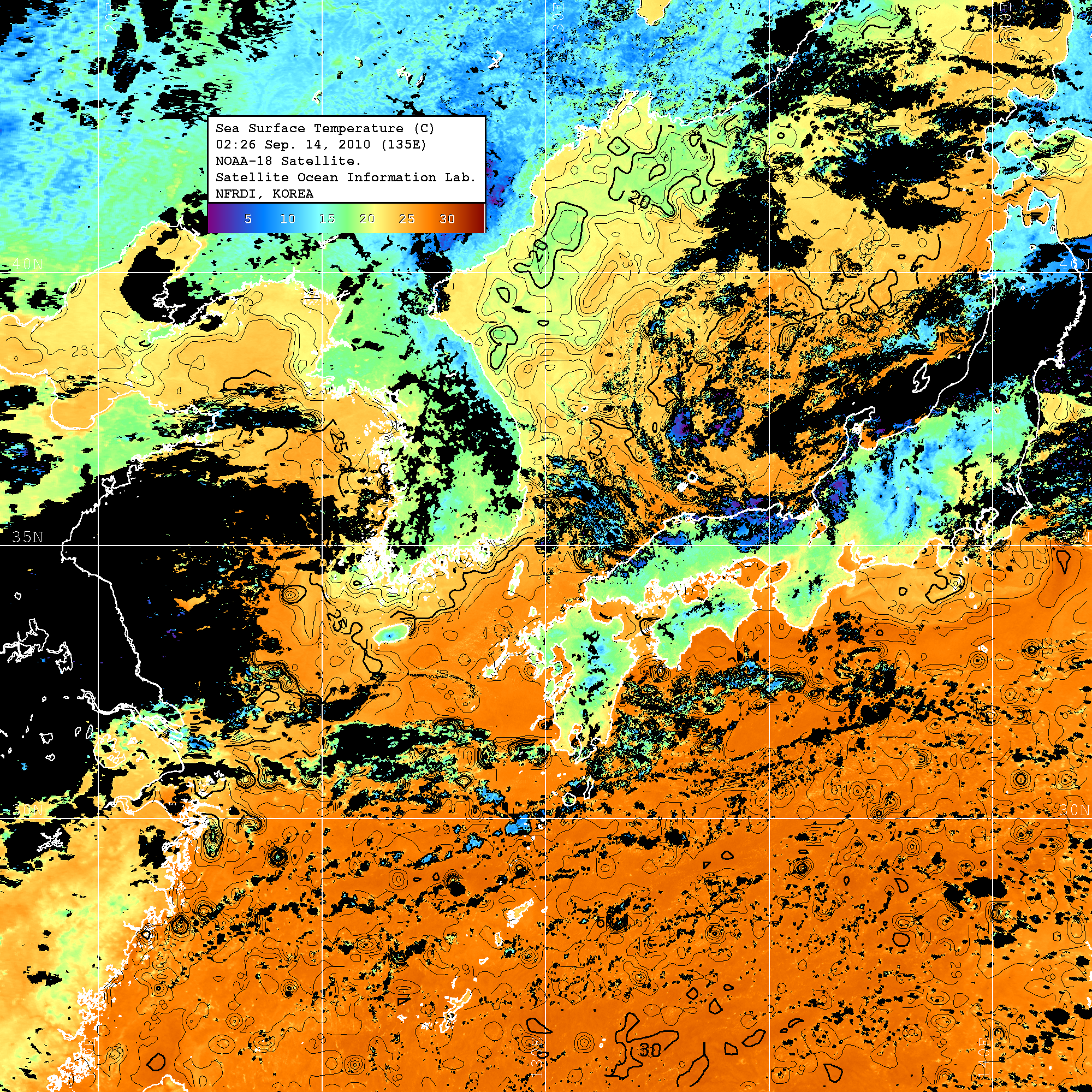 o 2010년 09월 14일 02시 26분 NOAA-18호 위성영상입니다. o 수온분포는 범례를 참고하시기 바랍니다. o 검은색은 구름을 나타냅니다. o 그림을 클릭하시면 크게 보실 수 있습니다.