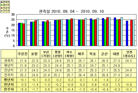 o 금주(2010.09.04~2010.09.10)의 한반도 연안 표면수온은 동해 연안역에서 섭씨 21.5~23.5도, 남해 연안역 24.5~25.5도, 서해 연안역에서 24.0~27.0도로 나타납니다. o 평년에 비해 부산(기장) 0.3도 높음을 제외한 동해 연안역은 비슷하게, 남해 연안역은 비슷하게, 서해 연안역은 1.5~2.0도 높게 나타납니다. o 전년에 비해 주문진 0.5도 높음을 제외한 동해 연안역은 1.0~1.5도 낮게, 여수(화양) 0.8도 낮음을 제외한 남해 연안역은 비슷하게, 인천(용유도) 0.8도 낮음을 제외한 서해 연안역은 0.5~1.5도 높게 나타납니다.