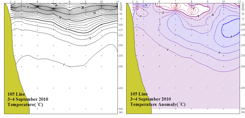ㅇ 2010년 9월 3~4일 국립수산과학원 동해수산연구소에서 조사한 105선(동해 동방)의 수직수온분포도 및 평년편차도입니다.