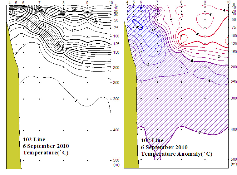 ㅇ 2010년 9월 6일 국립수산과학원 동해수산연구소에서 조사한 102선(포항 동방)의 수직수온분포도 및 평년편차도 입니다.