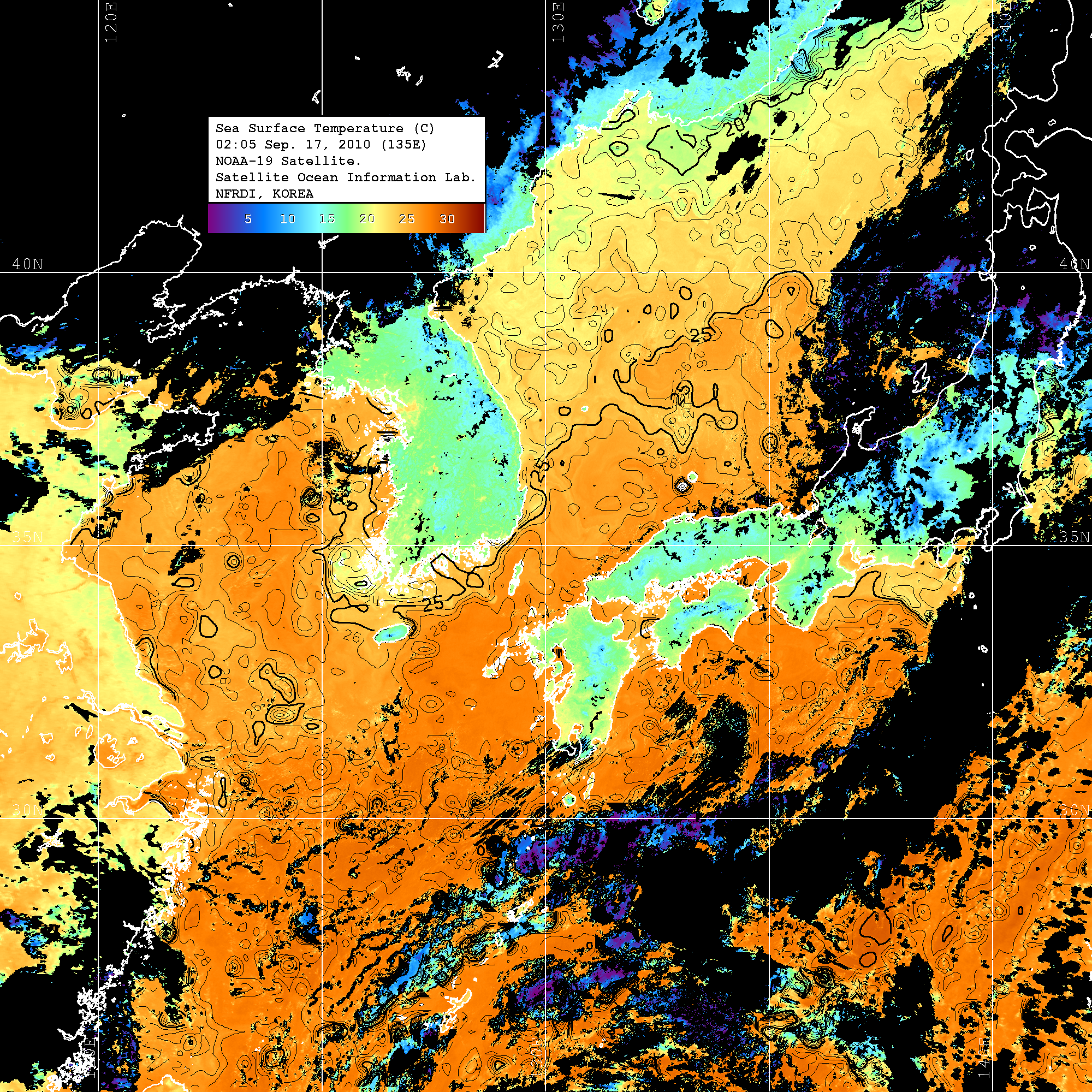 o 2010년 09월 17일 02시 05분 NOAA-19호 위성영상입니다. o 수온분포는 범례를 참고하시기 바랍니다. o 검은색은 구름을 나타냅니다. o 그림을 클릭하시면 크게 보실 수 있습니다.