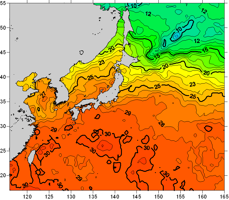 o 2010년 09월 16일 북서태평양 광역해양 수온분포 입니다. o 아래 위성 수온분포도는 국립수산과학원(NFRDI, Korea)과 일본동북대학교 (Tohoku University, Japan)가 공동연구개발 진행중, 1차 연구결과인 것으로 구름의 영향을 배제한 신기술의 수온정보입니다.