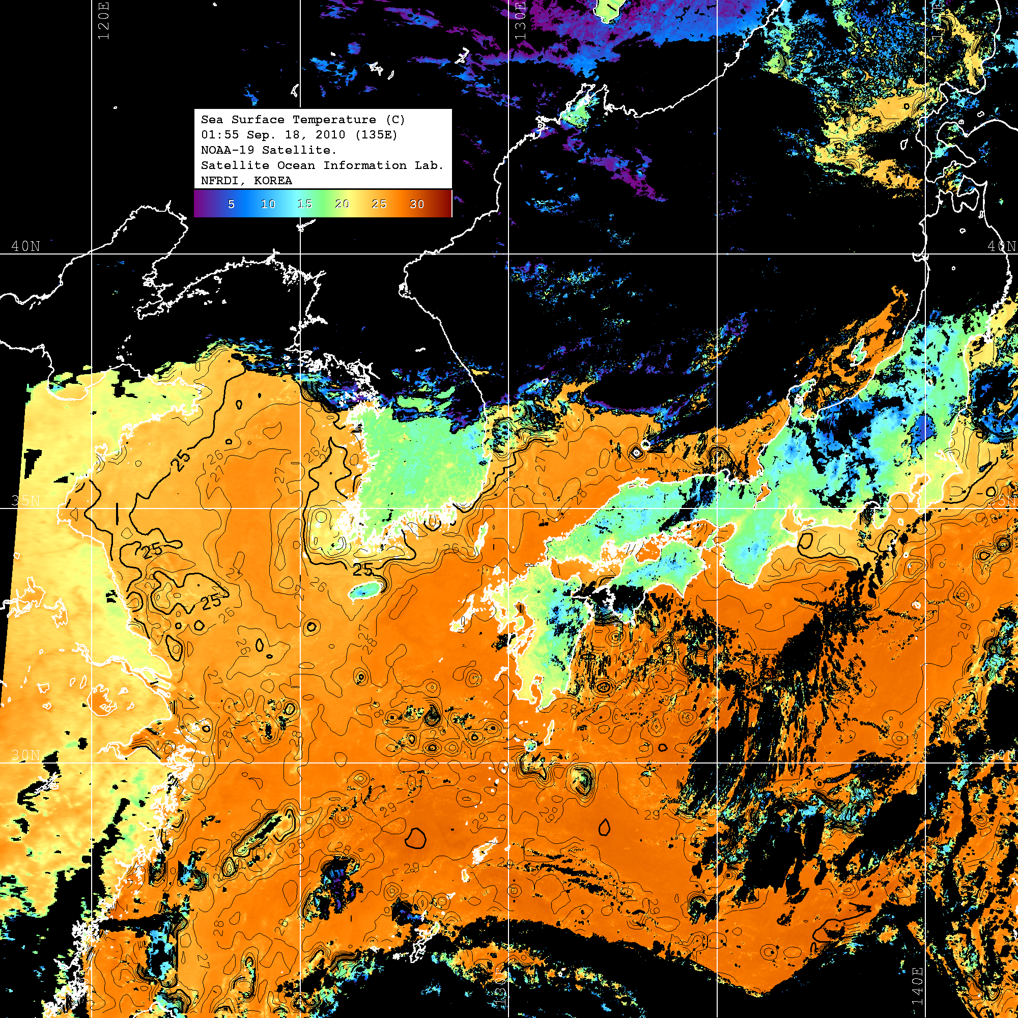 o 2010년 09월 18일 01시 55분 NOAA-19호 위성영상입니다. o 수온분포는 범례를 참고하시기 바랍니다. o 검은색은 구름을 나타냅니다. o 그림을 클릭하시면 크게 보실 수 있습니다.
