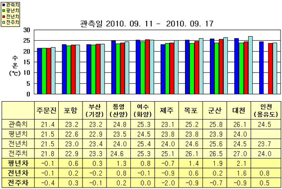 o 금주(2010.09.11~2010.09.17)의 한반도 연안 표면수온은 동해 연안역에서 섭씨 21.5~23.5도, 남해 연안역 23.0~25.5도, 서해 연안역에서 24.5~26.0도로 나타납니다. o 평년에 비해 주문진 비슷함을 제외한 동해 연안역은 0.5~1.0도 높게, 제주 0.7도 낮음을 제외한 남해 연안역은 0.5~1.5도 높게, 서해 연안역은 1.5~2.0도 높게 나타납니다. o 전년에 비해 동해 연안역은 비슷하게, 여수(화양) 0.8도 높음을 제외한 남해 연안역은 0.5~1.0도 낮게, 군산 비슷함을 제외한 서해 연안역은 0.5~1.5도 높게 나타납니다.