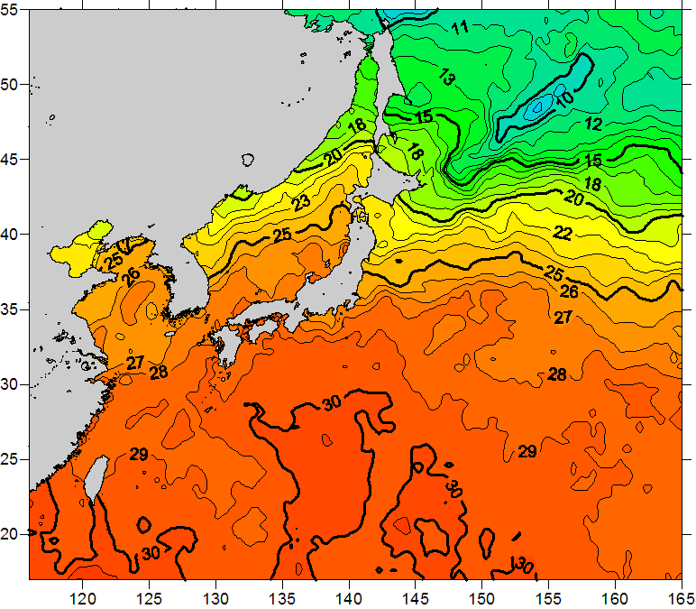 o 2010년 09월 17일 북서태평양 광역해양 수온분포 입니다. o 아래 위성 수온분포도는 국립수산과학원(NFRDI, Korea)과 일본동북대학교 (Tohoku University, Japan)가 공동연구개발 진행중, 1차 연구결과인 것으로 구름의 영향을 배제한 신기술의 수온정보입니다.