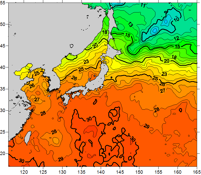 o 2010년 09월 19일 북서태평양 광역해양 수온분포 입니다. o 아래 위성 수온분포도는 국립수산과학원(NFRDI, Korea)과 일본동북대학교 (Tohoku University, Japan)가 공동연구개발 진행중, 1차 연구결과인 것으로 구름의 영향을 배제한 신기술의 수온정보입니다.