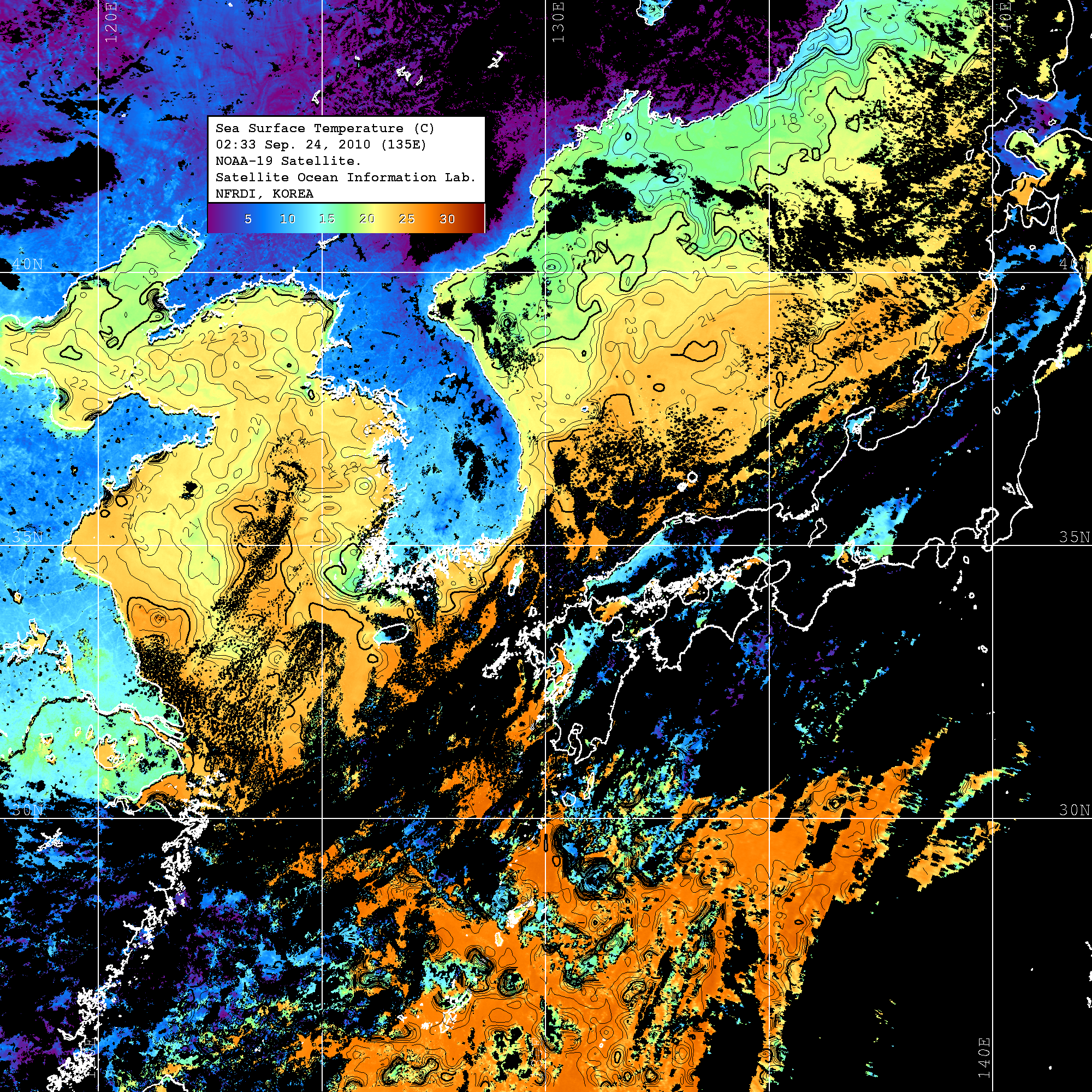 o 2010년 09월 24일 02시 33분 NOAA-19호 위성영상입니다. o 수온분포는 범례를 참고하시기 바랍니다. o 검은색은 구름을 나타냅니다. o 그림을 클릭하시면 크게 보실 수 있습니다.