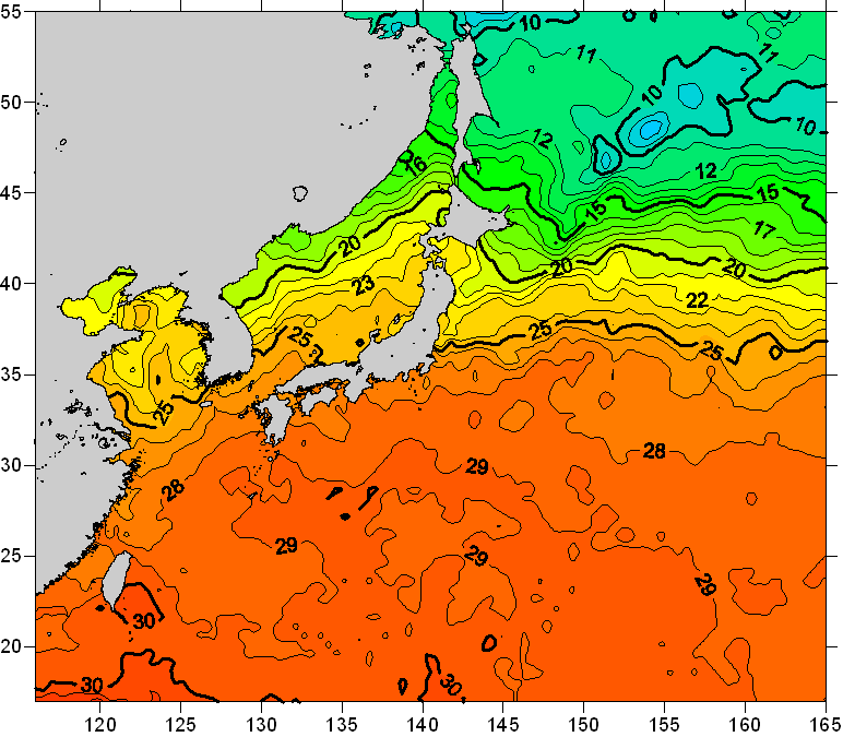 o 2010년 09월 24일 북서태평양 광역해양 수온분포 입니다. o 아래 위성 수온분포도는 국립수산과학원(NFRDI, Korea)과 일본동북대학교 (Tohoku University, Japan)가 공동연구개발 진행중, 1차 연구결과인 것으로 구름의 영향을 배제한 신기술의 수온정보입니다.