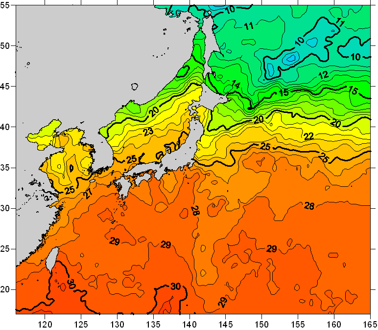 o 2010년 09월 25일 북서태평양 광역해양 수온분포 입니다. o 아래 위성 수온분포도는 국립수산과학원(NFRDI, Korea)과 일본동북대학교 (Tohoku University, Japan)가 공동연구개발 진행중, 1차 연구결과인 것으로 구름의 영향을 배제한 신기술의 수온정보입니다.