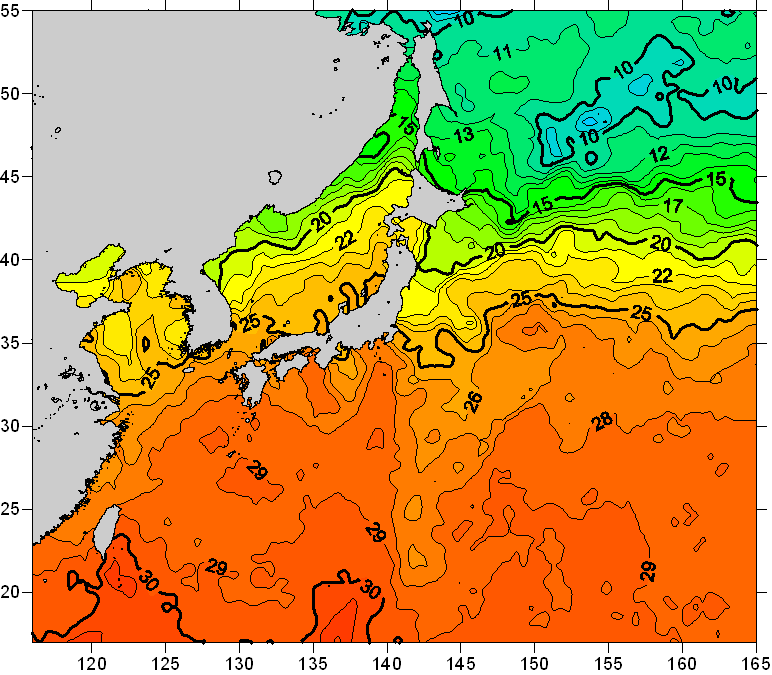 o 2010년 09월 26일 북서태평양 광역해양 수온분포 입니다. o 아래 위성 수온분포도는 국립수산과학원(NFRDI, Korea)과 일본동북대학교 (Tohoku University, Japan)가 공동연구개발 진행중, 1차 연구결과인 것으로 구름의 영향을 배제한 신기술의 수온정보입니다.