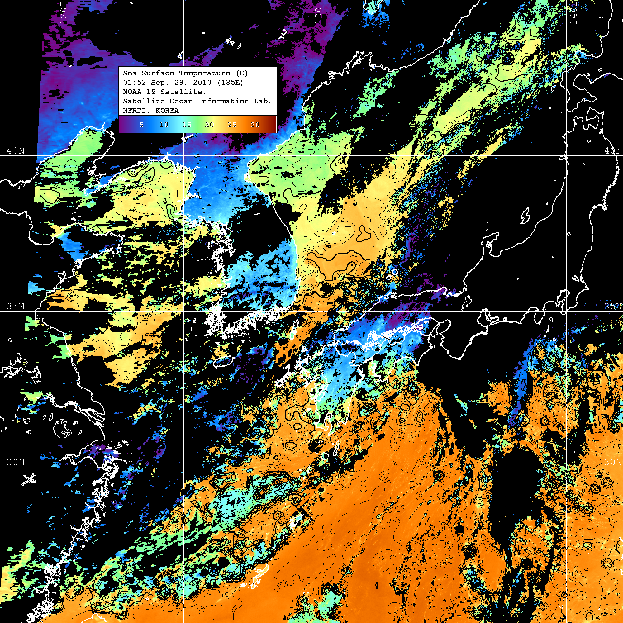 o 2010년 09월 28일 01시 52분 NOAA-19호 위성영상입니다. o 수온분포는 범례를 참고하시기 바랍니다. o 검은색은 구름을 나타냅니다. o 그림을 클릭하시면 크게 보실 수 있습니다.